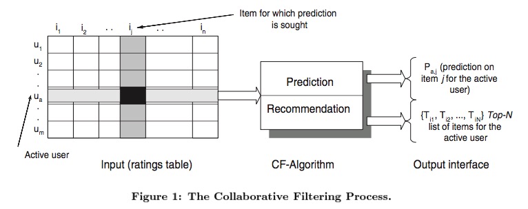Figure 1 shows the schematic diagram of the collaborative filtering process. CF algorithms represent the entire m×n user-item data as a ratings matrix, A. Here ‘m’ is the number of users and ‘n’ is the number of items. Each entry in A represents the preference score (ratings) of the ith user on the jth item. Each individual ratings is within a numerical scale(e.g., from 1 to 5, the higher the better) and it can as well be 0 or NULL indicating that the user has not yet rated that item.