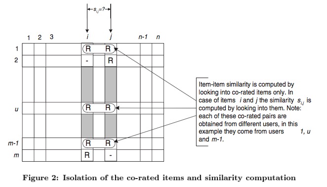 Two items are thought of as two vectors in the m dimensional user-space. The similarity between them is measured by computing the cosine of the angle between these two vectors.